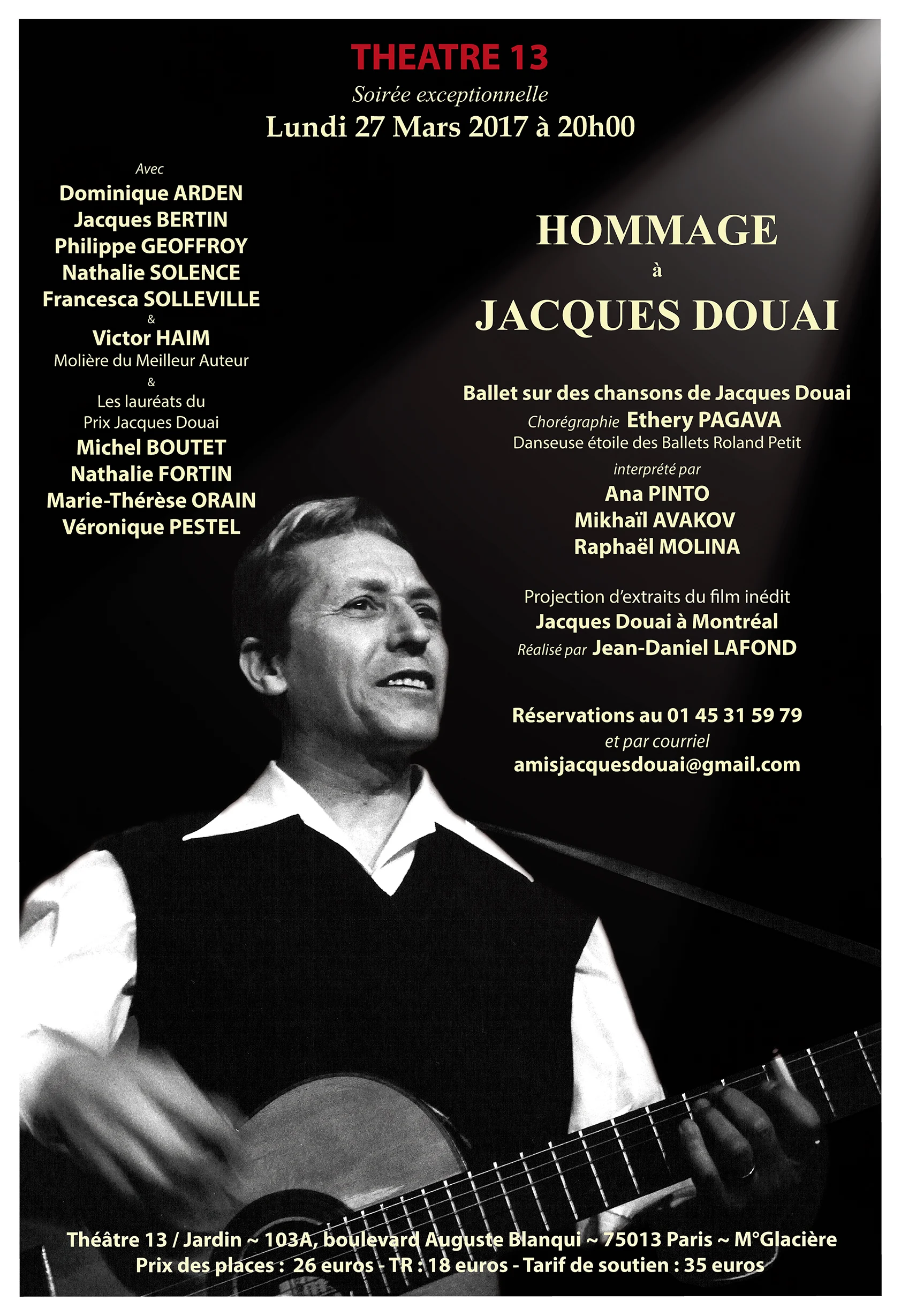 Ce lundi 27 mars 2017, au Théâtre 13 à Paris, je rends hommage à mon ami Jacques Douai, chanteur et ménestrel, décédé en 2004. Je serai en compagnie de son épouse Ethery Pagava et des amis de Jacques Douai, artistes, poètes et musiciens.